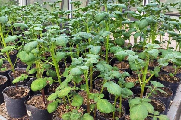 Planta de Papin andino en maceta de cultivo. papines ya brotados